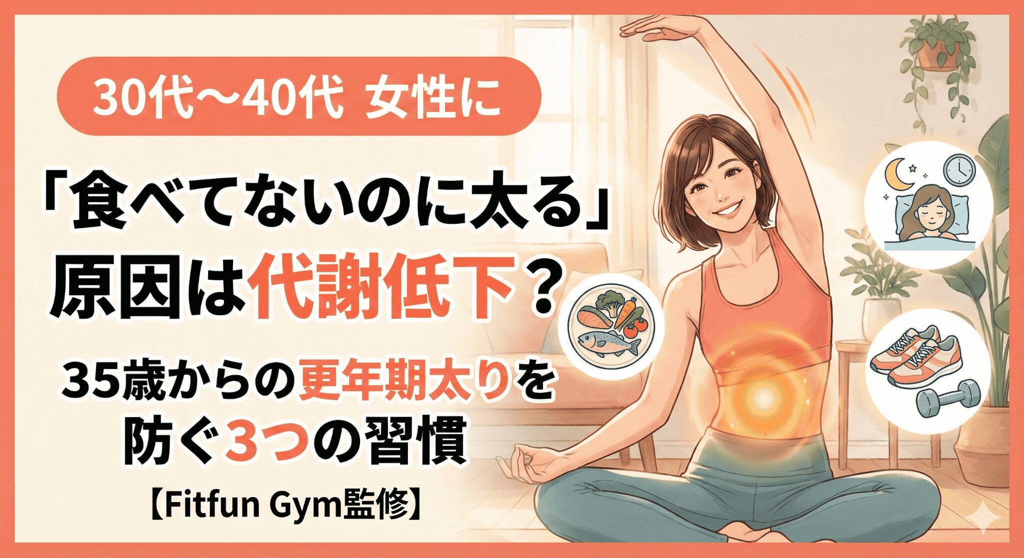 「食事の量は昔と変わっていないはずなのに、なぜか体重が増えていく…」「もしかして、空気を吸っているだけでも太るんじゃないか?」30代後半から40代にかけて、そんな切実な悩みを抱える女性は少なくありません。若い頃なら少し食事を抜けばすぐに戻った体重が、ビクともしなくなる。この焦りと不安、とてもよくわかります。しかし、自分を責めないでください。その原因はあなたの「食べ過ぎ」や「意志の弱さ」ではありません。原因は、年齢とともに体の中で起きている「代謝のエンジントラブル(基礎代謝の低下)」にあります。焦って無理な食事制限をするのは、実は逆効果です。火が消えかかっているエンジンに燃料(栄養)を入れなければ、体は防衛反応でますます脂肪を溜め込もうとしてしまいます。今必要なのは、食事を「減らす」ことではなく、眠ってしまった「燃やす力を取り戻す」ことです。この記事では、年間100名以上のダイエットをサポートするFitfun Gym編集部が、更年期に向けて備えるべき「痩せ体質を取り戻す3つの習慣」を解説します。「もう年だから…」と諦める前に、まずは体の仕組みを知るところから始めましょう。