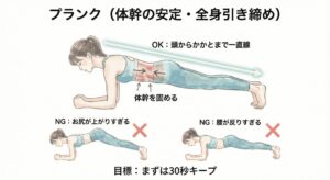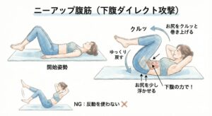 骨盤後傾タイプは、腰が丸まり、お尻が垂れやすくなる姿勢が特徴です。腰が丸いことで腹筋は常に“縮んだまま”になっており、一見「腹筋が使えているように見えて実は機能していない」状態が続いています。後傾タイプが下腹に効かせるためには、丸まった骨盤を起こし、腹筋を“伸ばせる状態”に戻すことが最優先です。猫背・後傾タイプに向いているのは、インナーを働かせながら腹筋を自然に伸ばせるプランク(腰を落とさないフォーム)、骨盤を立てた状態で下腹を意識するニーアップ腹筋などです。