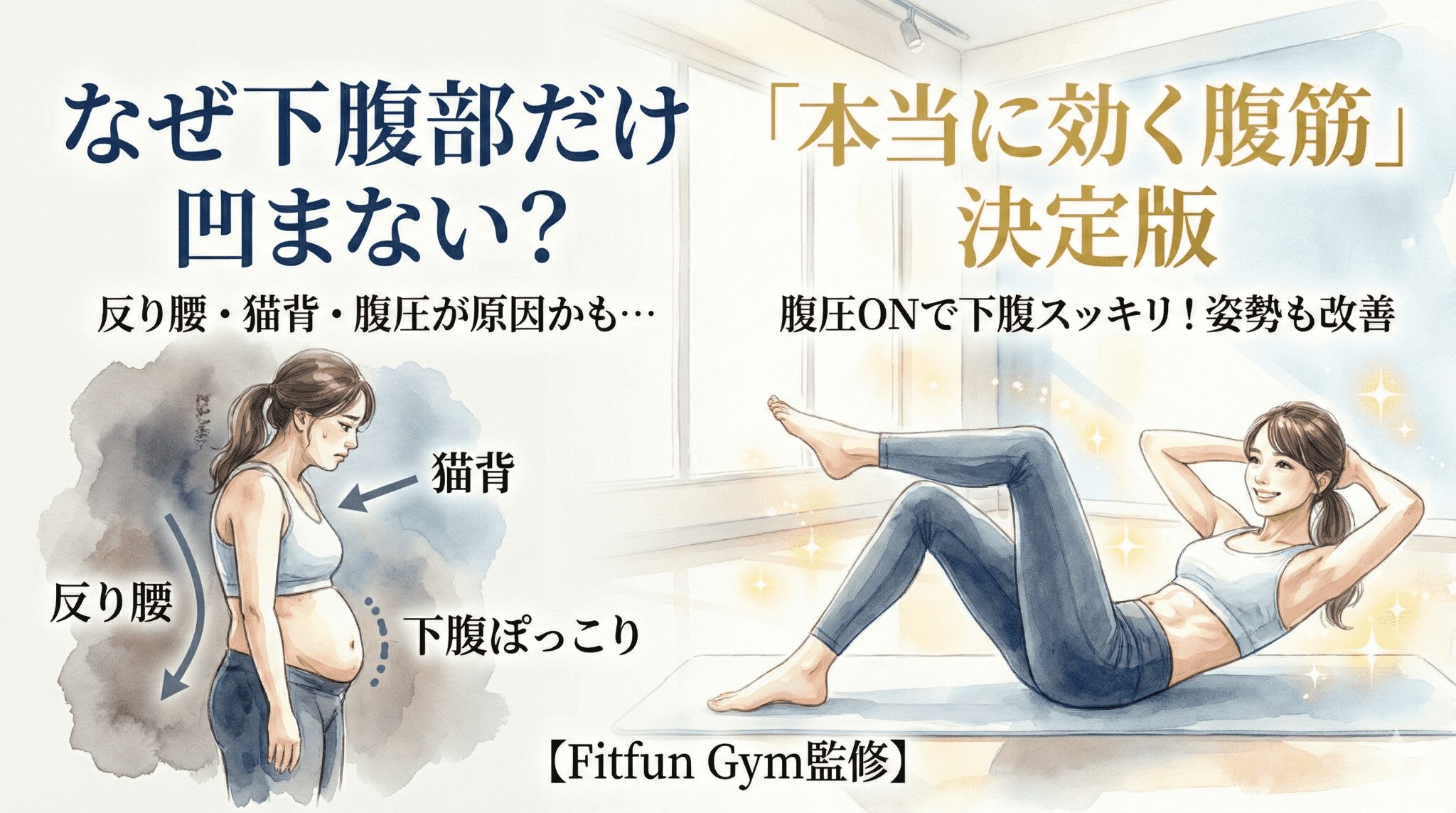 Fitfun Gymでは、下腹が凹まない原因になりやすい「反り腰・骨盤後傾・浅い呼吸・腹圧の弱さ」を専門トレーナーが丁寧にチェックし、あなたの身体タイプに合わせた“効く腹筋”を提案します。その場しのぎの腹筋ではなく、根本から下腹が引き締まるフォーム・呼吸・姿勢づくりを徹底サポートします。たった1回の体験でも「下腹に力が入りやすくなった」「姿勢が変わった」と実感される方が多いです。初回はカウンセリング+姿勢・骨盤チェック+体験トレーニング(30分)をすべて無料でご利用いただけます。「何をしても下腹が凹まない…」という方こそ、一度プロの分析を受けてみてください。