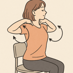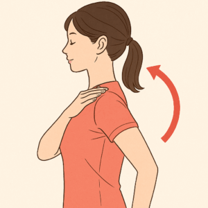二の腕が太く見える人の多くは、肩が内側に入り込む「巻き肩」になっています。巻き肩は、肩甲骨が外側に引っ張られている状態で、二の腕の後ろ側が使われなくなる原因です。まずは鏡を見ながら、肩の力を抜いて軽く胸を開き、肩を少し後ろに引くだけでも二の腕のラインが変わって見えます。このとき、胸を張りすぎず、自然に呼吸ができる範囲で行うことがポイントです。