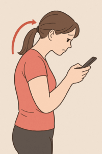 さらに、多くの人が気づいていないのがデスクワーク中の姿勢です。パソコン作業では、腰が丸まり、腕が自然と前に突き出る姿勢になりやすく、二の腕の筋肉は常に前方に引っ張られた状態になります。この姿勢が続くと肩甲骨の動きが悪くなり、本来背中と連動して使われるべき二の腕の後ろ側がサボってしまい、反対に前側が張り続けることで太く見える原因になります。また、スマホ操作も二の腕を太く見せる大きな要因のひとつです。スマホを見る姿勢では、肩が内巻きになり、肘を身体の前で固定したまま指先だけ動かす状態が長く続きます。この姿勢がクセになると腕の付け根の位置が本来より前にずれ、二の腕の厚みが強調されて見えてしまいます。