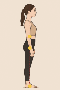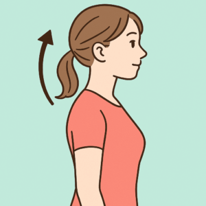 スマホ首や猫背になると、頭が前に出て重心も前へズレるため、腕が身体より前に飛び出したような姿勢になります。この状態だと二の腕が分厚く見えてしまうため、まずはアゴを軽く引き、首がスッと伸びる感覚を意識してみてください。頭の位置が整うと腕が自然と身体の横へ戻り、二の腕の見た目が一気にスリムになります。姿勢を正すというより「頭の位置を戻す」イメージのほうがうまくいきます。