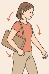 二の腕がなかなか細くならないと悩む女性の多くは、実は「特別な運動をしていないから」でも「脂肪が落ちにくいから」でもなく、日常の中で無意識に繰り返している“生活習慣”が原因になっていることが非常に多くあります。普段の姿勢や動きのクセが積み重なることで、二の腕に負担が偏ったり、本来使われるべき筋肉が眠ったままになったりして、結果として太く見えてしまうのです。まず代表的なのが、カバンをいつも同じ側で持ち続ける習慣です。このクセにより身体の左右のバランスが崩れ、片側の肩が下がったり、逆に引き上がったりして肩のねじれが強くなります。肩の位置がズレると二の腕の後ろ側が使われにくくなり、腕の前側や外側ばかりが張ってしまうため、実際以上に丸く太く見えてしまいます。